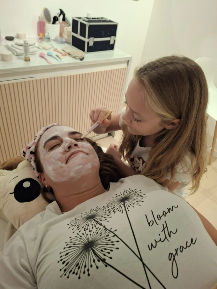 - Vervolgens is het mama’s (of queen’s 😉) beurt: Zij krijgt eveneens een zachte gezichtsreiniging, een gezichtsmasker en een heerlijke massage van armen, handen, benen en voeten. Daarna wordt haar gezicht nog lichtjes gemasseerd en ingesmeerd met een hydraterende crème.